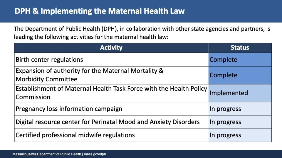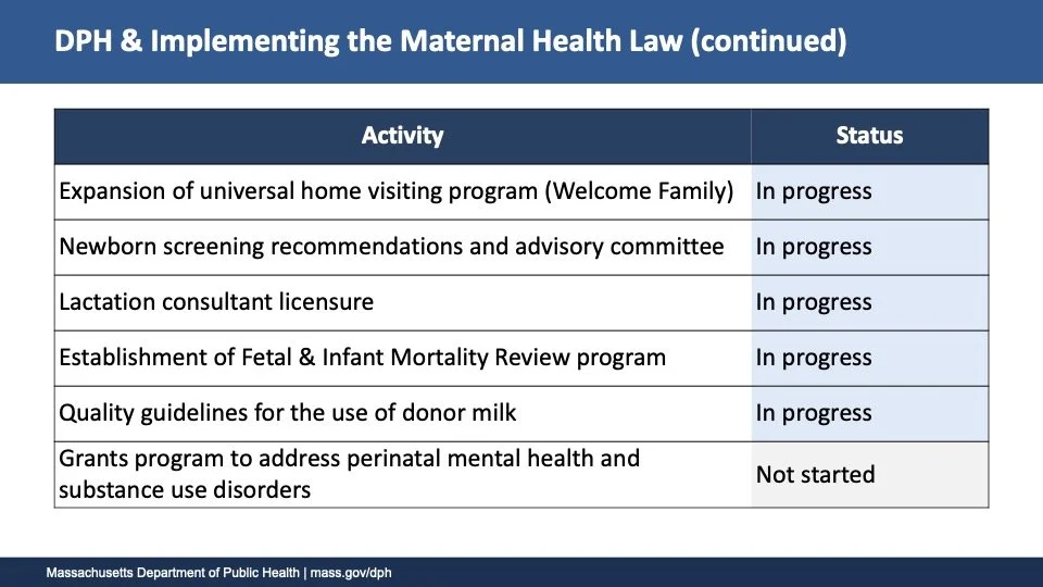 Dr. Fitzgerald Lewis shared status updates on implementation since the bill was signed into law in August of 2024. In less than a year, some of aspects of the law have been fully implemented, such as modernization of state birth center regulations, expansion of the Maternal Mortality and Morbidity Review Committee, and establishment of a state Maternal Health Task Force. Others are in progress, as shown in the chart below. Slides available here.